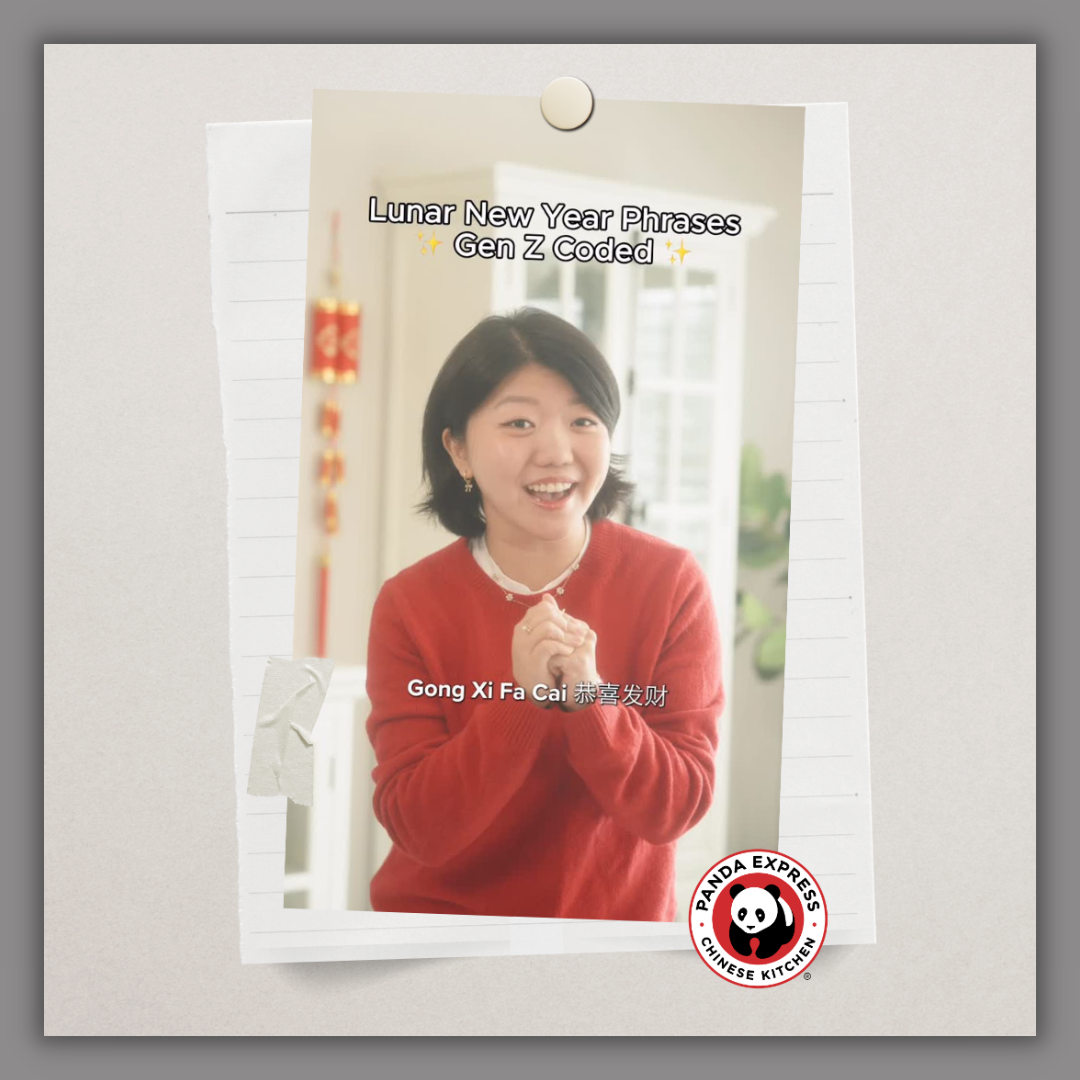 Client TJ Lee is ringing in the Lunar New Year with a fresh, Gen Z-inspired take on traditional greetings. In her latest partnership with Panda Express, TJ breaks down classic phrases like “Xīn nián kuài lè” and “Gōng xǐ fā cái,” sharing their meanings while adding playful, modern translations for today’s audience.
